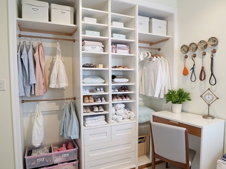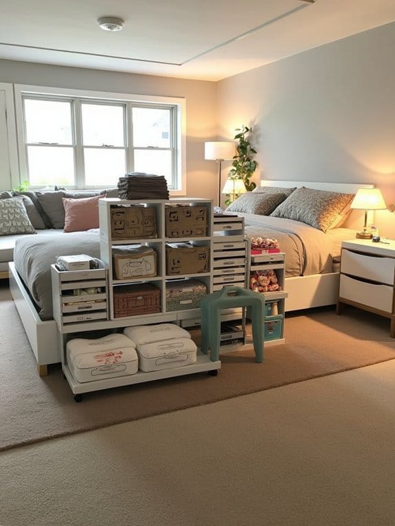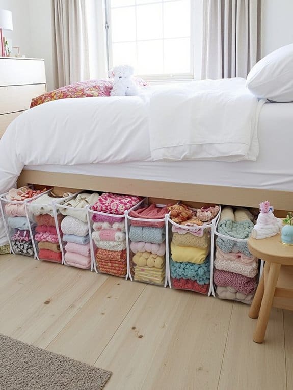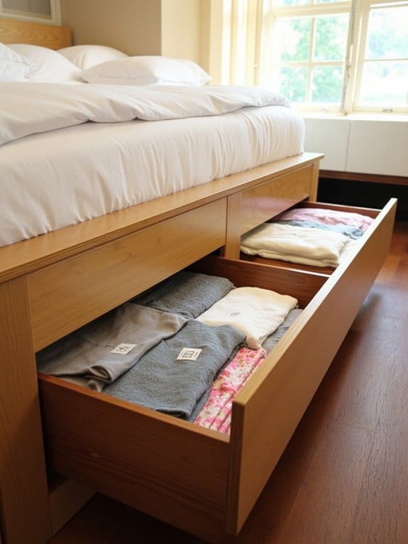 While organizing your bedroom, consider the hidden potential of under-bed storage drawers to maximize space. These gems are perfect for under bed organization, turning wasted areas into functional storage for maximizing space. Stash seasonal clothes or extra bedding in drawers typically 24 inches wide and 18 inches deep.