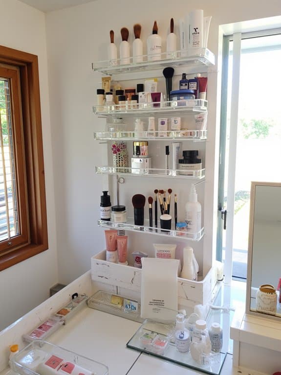 As you streamline your bedroom with storage bag organizers, consider adding a Vanity Organizer Rack to keep your beauty essentials in check. This handy tool boosts makeup organization and guarantees every beauty product has a spot. Place it on your dresser; it often measures about 12×8 inches, fitting nicely without cluttering.