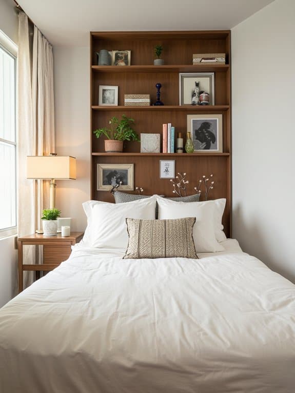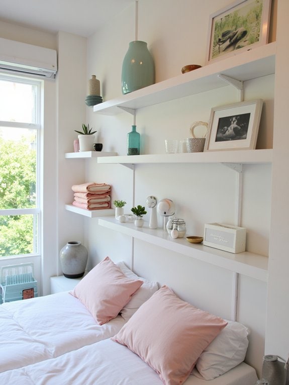 As you look to maximize your bedroom space, consider installing floating wall shelves for a sleek storage solution. These shelves not only save floor space but also double as stylish wall decor. You can customize them with hidden compartments for private items like diaries or keys.