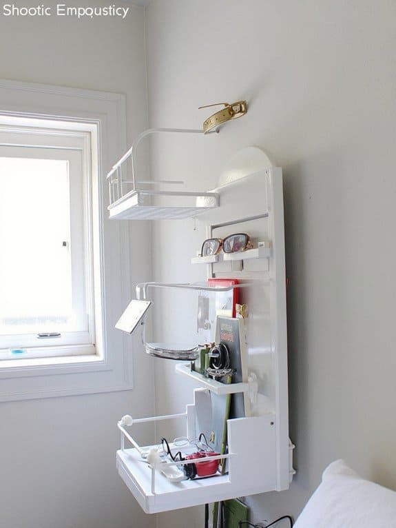 Let’s shift focus from the Storage Tower Headboard to another smart solution with Bedside Caddy Storage that keeps your essentials close. This handy tool attaches to your bed frame, ensuring clutter reduction by organizing bedside essentials like glasses and books.