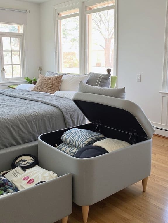 Moving from the hidden potential of under-bed drawers, consider another smart solution with multifunctional ottoman storage for your bedroom. You can transform your space with various ottoman styles that double as storage solutions. Pick one that fits your decor, like a sleek 24-inch square ottoman.