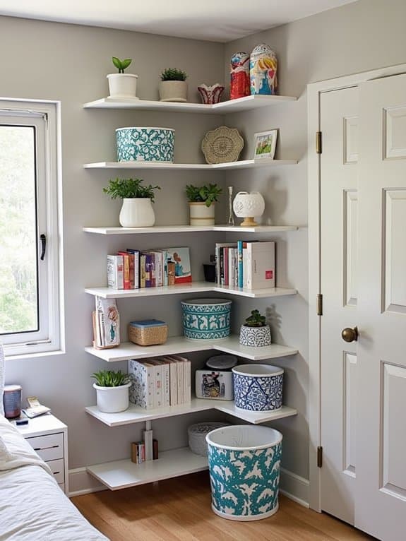 Take a look at transforming those empty bedroom corners with a practical corner shelving unit. It’s a smart way to boost space optimization and enhance corner aesthetics in your bedroom. Install a unit about 5 feet tall to maximize vertical space without overwhelming the room.
