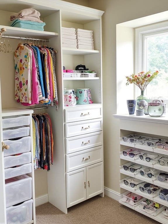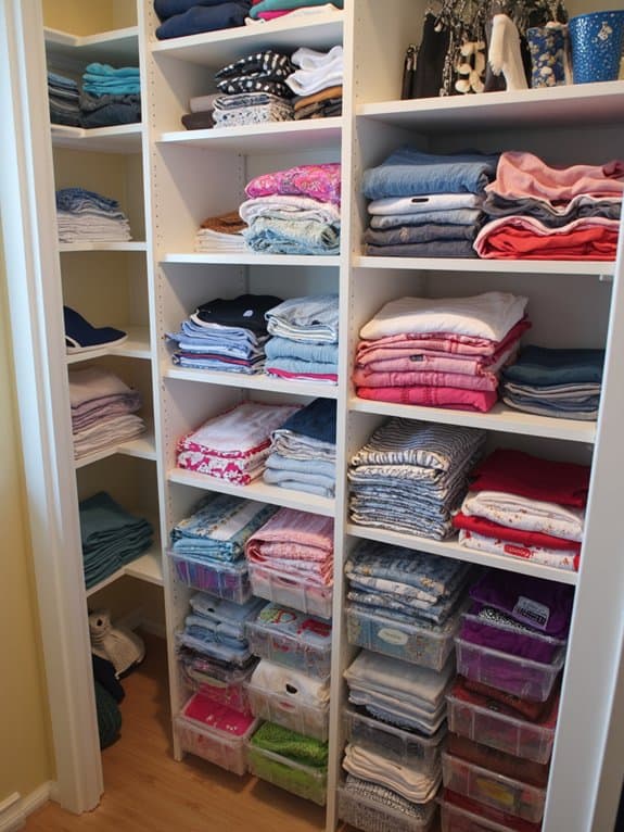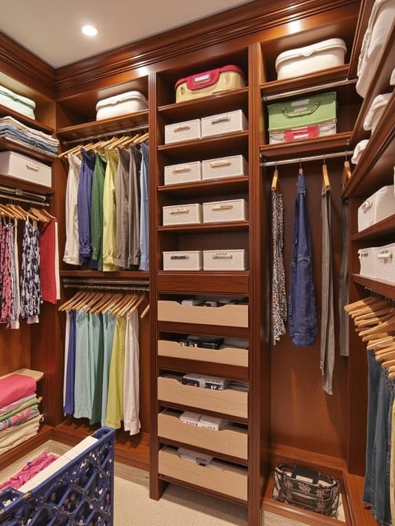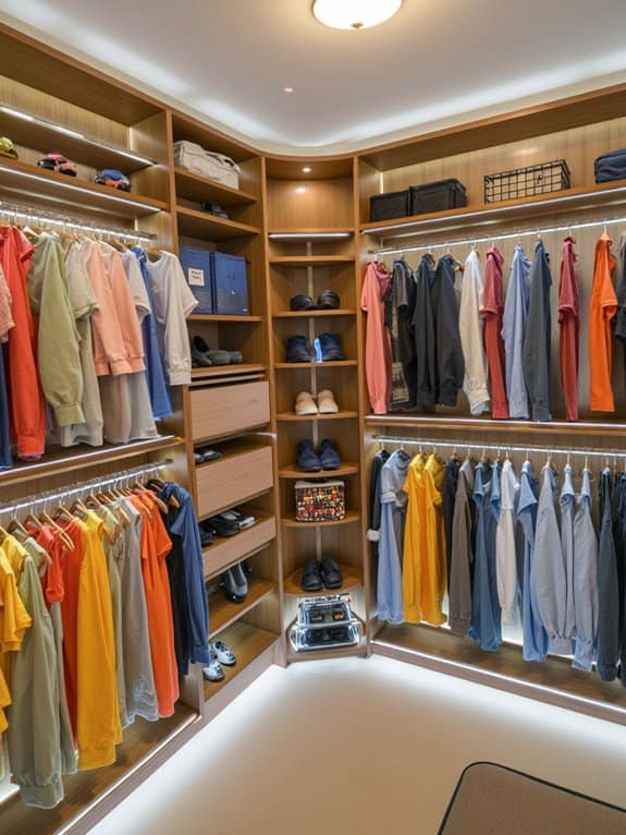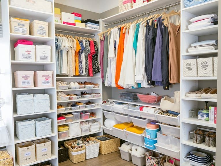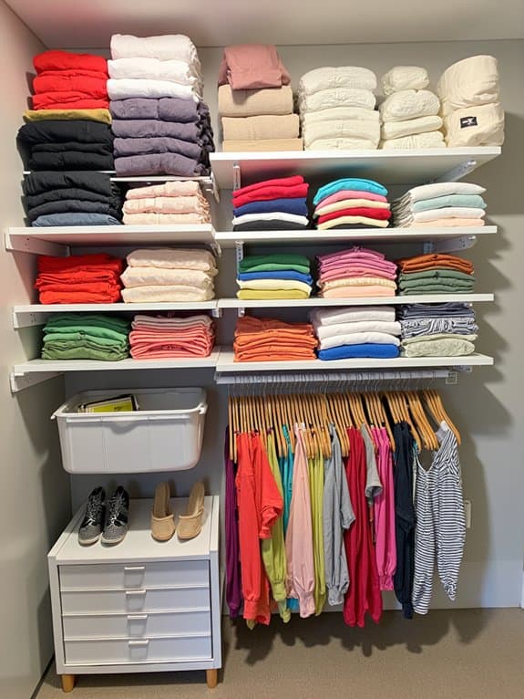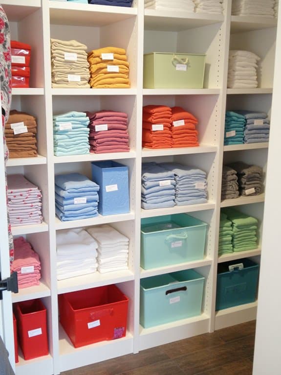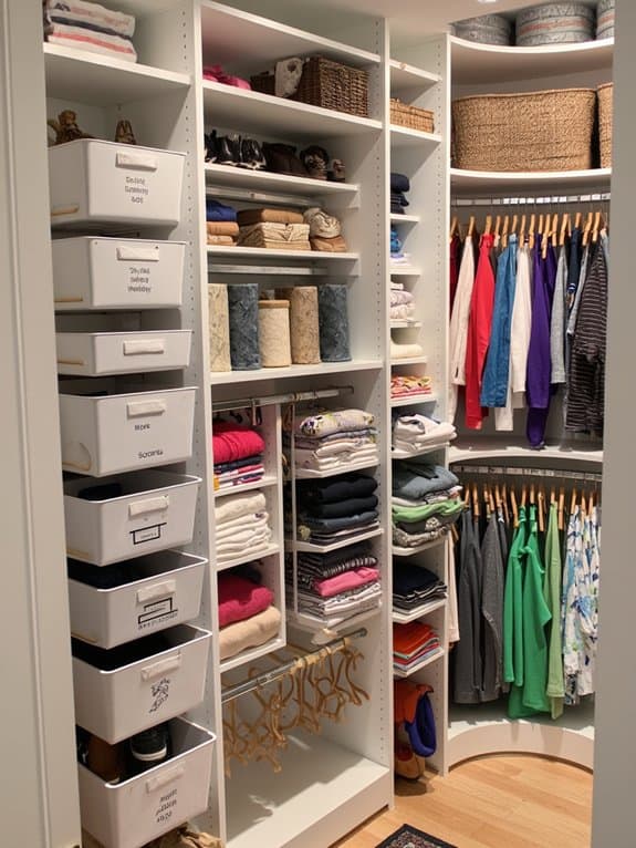 Ever thought about making your closet organization even sharper with a color-coded labeling system? You can transform chaos into order with simple color coordination. Match labels to categories—blue for shirts, red for pants—and stick them on bins or shelves. Customize based on your label preferences to make it personal.