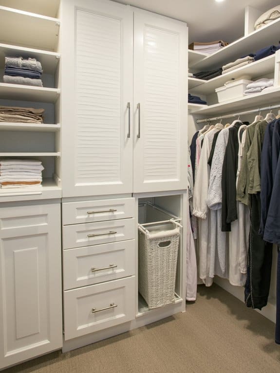Let’s shift focus from innovative storage tricks to a practical addition that keeps your closet tidy. A built-in hamper solution transforms laundry organization with smart hamper placement. Install it in a lower corner, ideally 24 inches wide by 18 inches deep, to hide dirty clothes.