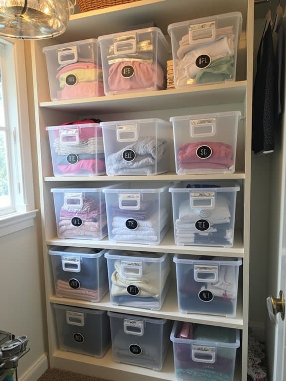 Dive right into organizing with a labeled bin system to make your closet a breeze to manage. With labeled bins, you’ll find items fast and keep chaos at bay. Grab some 12-quart bins, about 16 inches long, and label them for socks, scarves, or belts. Place them on shelves for easy access within 10 minutes of setup.