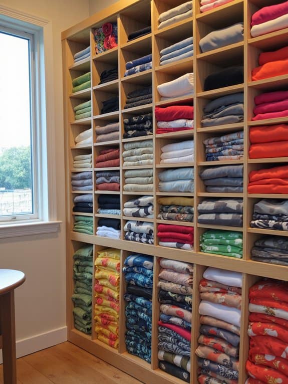 Crafting custom shelf dividers can transform your closet into a neatly organized haven with minimal effort. You’ll love how a thoughtful shelf design keeps everything in place. Choose from material options like wood or acrylic, cut to fit your shelves (measure 12-18 inches wide for stability).