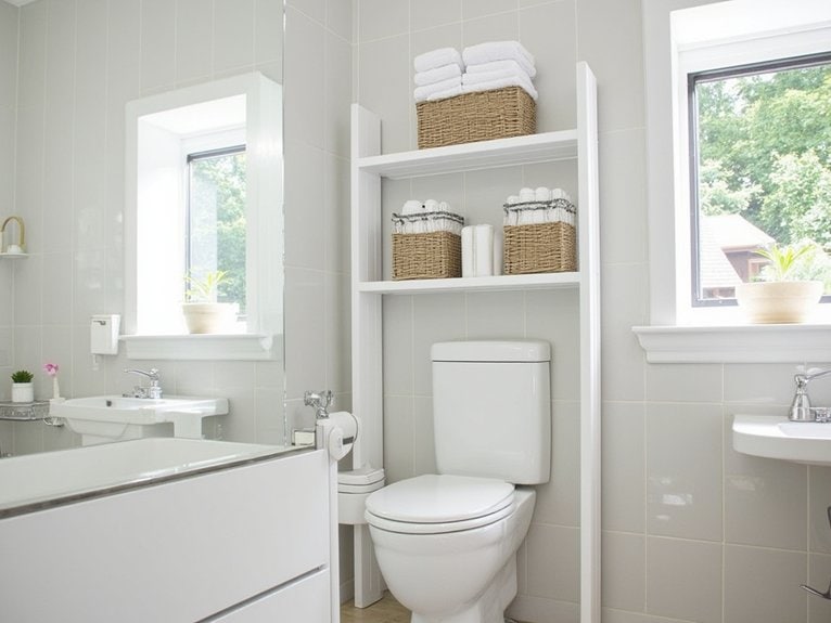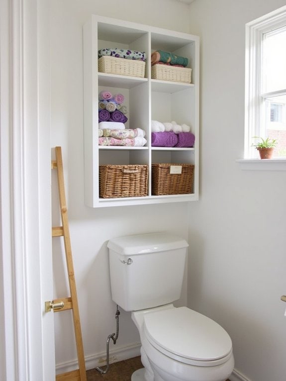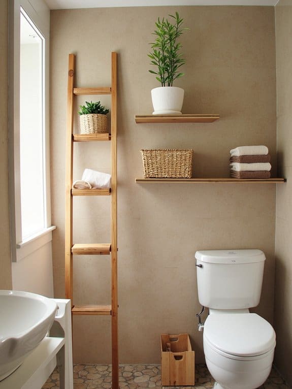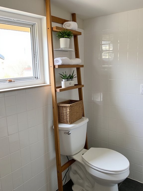 While enhancing your bathroom’s style, consider a Decorative Ladder Shelf to elevate both storage and aesthetics above your toilet. This clever addition maximizes vertical space in small bathrooms, often fitting neatly with a ladder shelf design that’s about 5 feet tall and 2 feet wide.