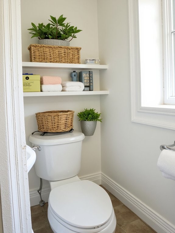 Hey there, let’s transform your bathroom with clever over-toilet storage! You can maximize space with ideas that fit any style or budget. Think floating shelves at 30 inches wide, installed in under 40 minutes, or rustic crates for a cozy vibe. “Start small to test functionality,” advises home organizer Jane Smith. Want to see all 15 ideas to organize your space? Stick around for the full breakdown!