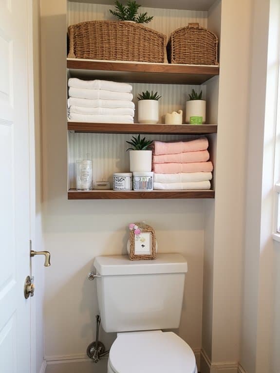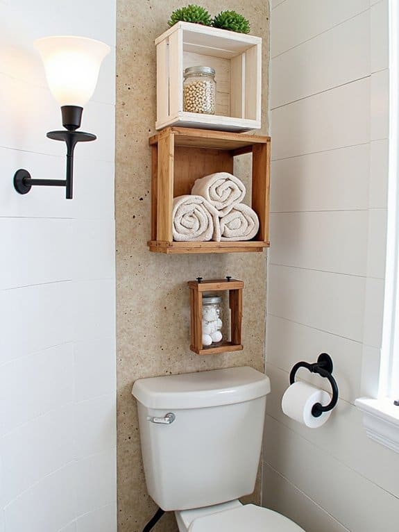 While exploring creative storage solutions, consider rustic crate shelving to add a charming farmhouse vibe over your toilet. You can transform old wooden crates into stunning shelving solutions with minimal effort. Mount them securely above your toilet, ensuring they’re level and spaced about 12 inches apart for accessibility.