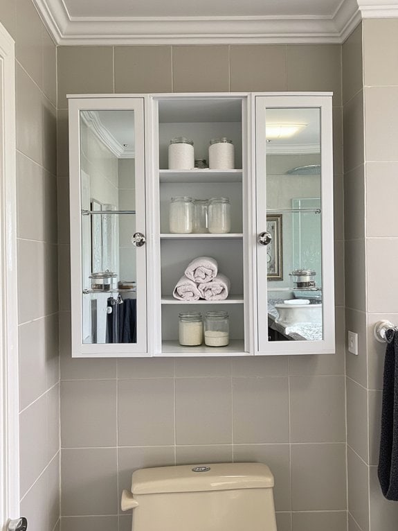 As you explore more bathroom storage solutions, consider glass-front storage cabinets for a stylish and practical upgrade over your toilet. These cabinets offer a sleek look while maximizing space, often measuring around 25 inches wide and 30 inches tall. With glass door features, you can see items easily, ensuring stylish organization.
