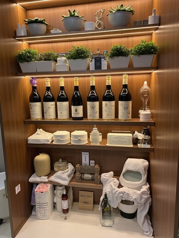 Moving from the sleek appeal of glass-front cabinets, you’ll find a creative twist with innovative wine rack storage for your bathroom. Repurpose a wine rack over the toilet for unique flair and function. With wine rack functionality, it’s perfect for towel organization.