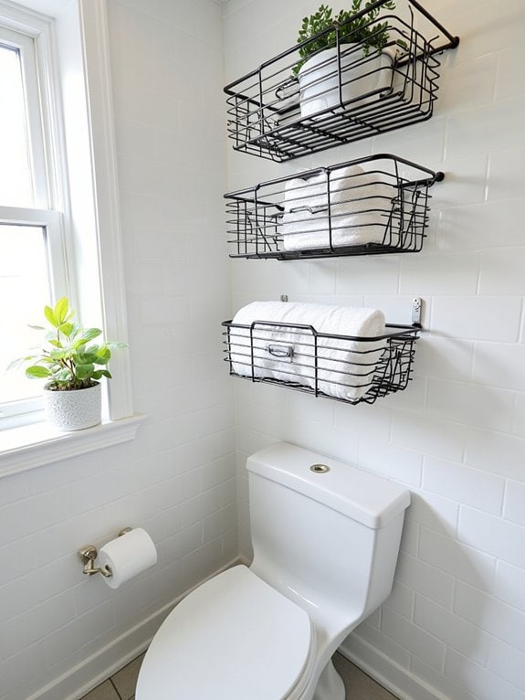 Let’s plunge into wire basket storage, a stylish and practical way to organize your bathroom essentials above the toilet. You’ll love the wire basket benefits, like easy access and airflow to keep towels fresh. Plus, wire basket styles range from sleek modern to rustic charm, fitting any decor.