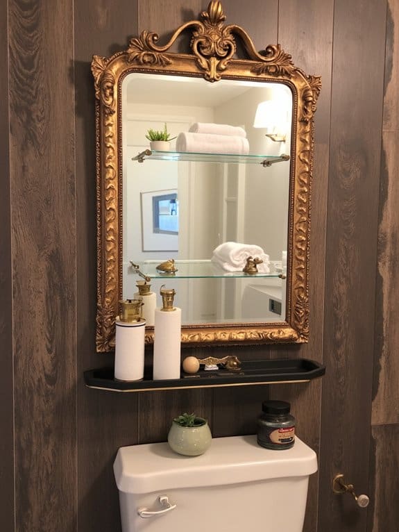 As you look to add both style and storage to your bathroom, consider the unique charm of Vintage Mirror Shelf Storage above your toilet. With vintage aesthetics, it blends old-world charm and practicality. The mirror functionality lets you check your reflection while grabbing essentials.