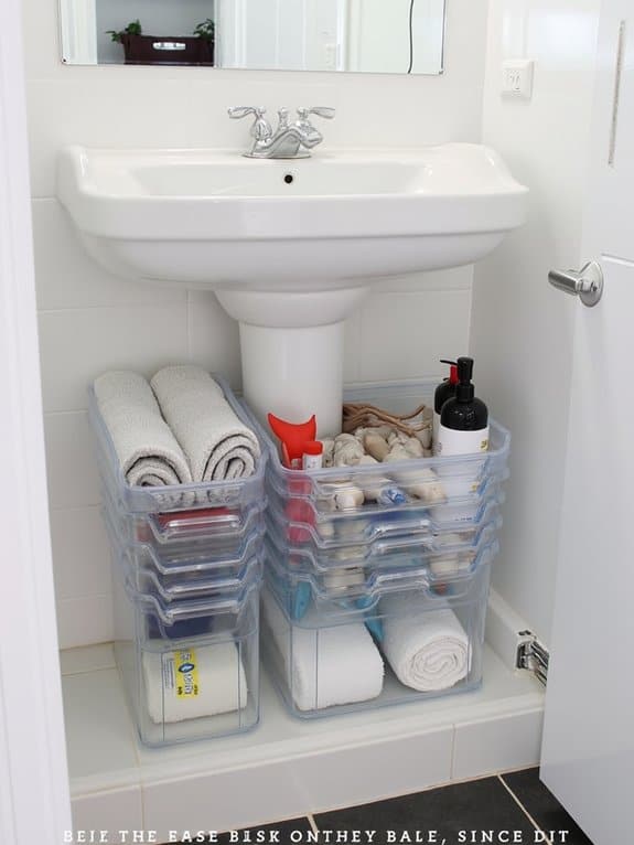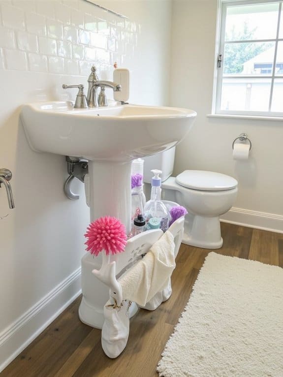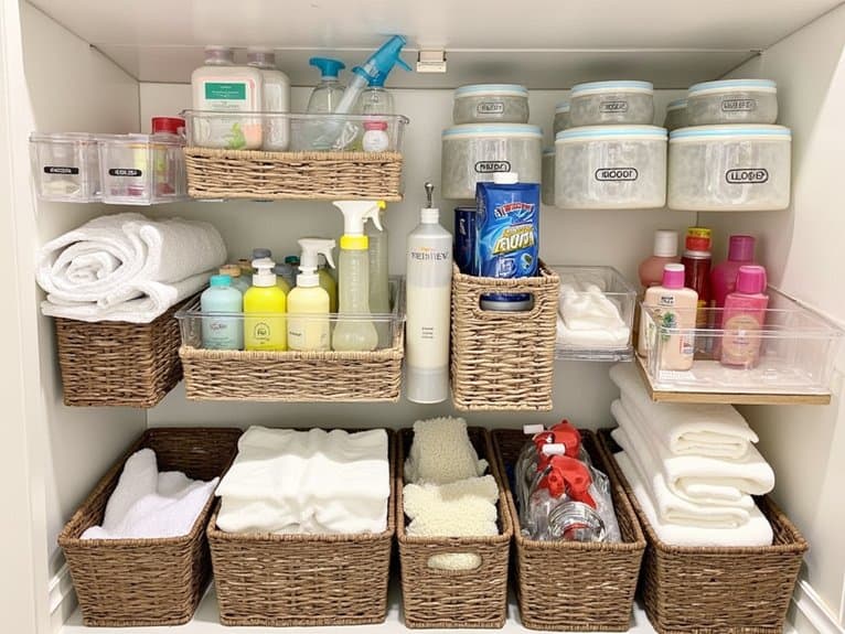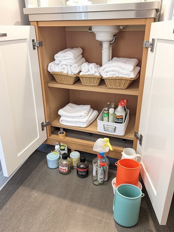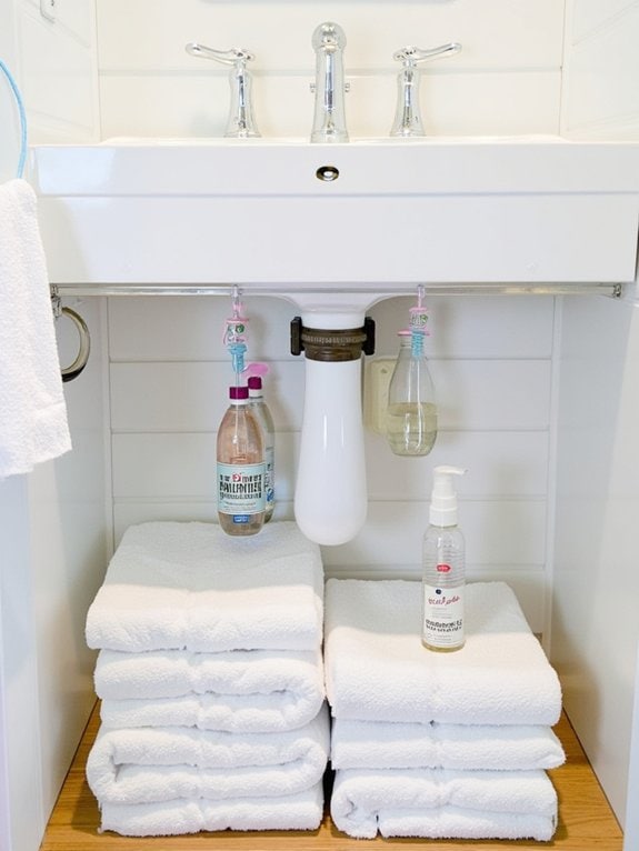 Countless homeowners struggle with under-sink clutter, but plastic bin organization can transform that chaos into order fast. You’ve got this! Grab some clear plastic bins, ideally 12”x6”x4”, to fit most under-sink spaces. Use bin labeling with sticky notes or a label maker to identify contents instantly. Try bin stacking to maximize vertical space, stacking two or three bins if they’re sturdy.