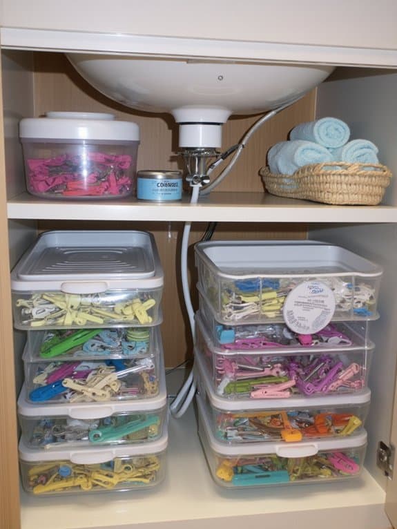 Discover a clever way to tidy up your bathroom under-sink area with a simple clothespin storage solution. You can use clothespin hacks to hang items like gloves or small brushes inside cabinet doors, saving space. If you’re looking for clothespin alternatives, try small hooks or clips for similar results.