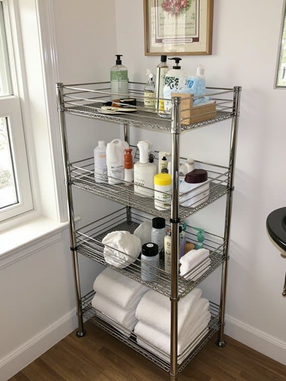 While organizing under your bathroom sink can feel tricky, an expandable shelving solution offers a smart, adaptable fix. You can customize these shelves to fit tight spaces, often adjusting from 15 to 25 inches wide. With shelf height adjustment, stack items like towels or cleaners efficiently, maximizing vertical space.