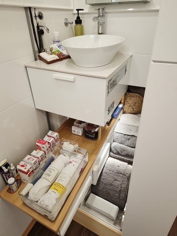 As you tackle the challenge of under-sink organization, consider sliding drawer innovations to transform cluttered spaces into neat storage zones. These drawers maximize space with smooth sliding mechanisms, making access a breeze. Choose sturdy drawer materials like metal or durable plastic for long-lasting use.