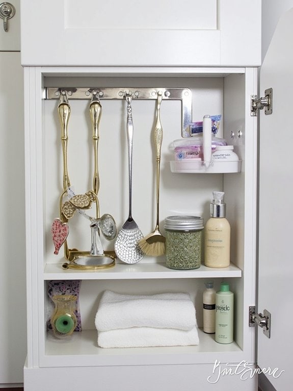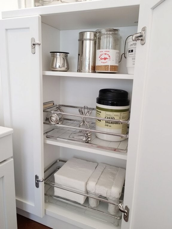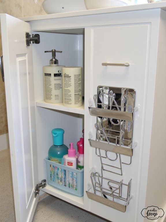 Let’s shift focus from tension rods to another smart storage idea with spice racks for your bathroom under-sink area. You can transform cluttered spaces with clever spice rack placement, fitting them on cabinet walls or corners. Choose durable spice rack materials like stainless steel or plastic for longevity. Maximize space with these tips: