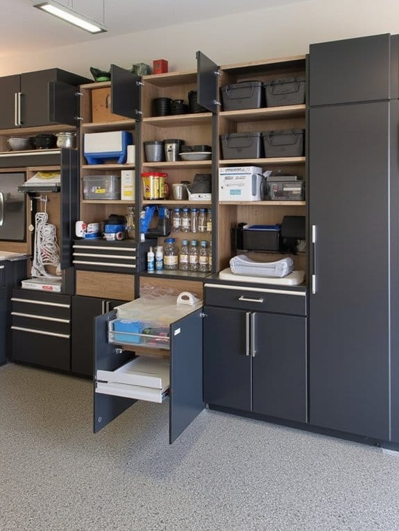 While organizing your garage might seem challenging, starting with storage cabinets installation can make a huge difference. You’ll transform your garage layout by maximizing space and reducing clutter. Choose sturdy cabinet materials like steel or heavy-duty plastic for durability, ensuring they last years.