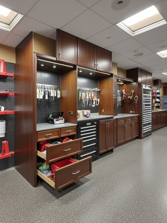 As you plunge into organizing your garage, consider custom cabinet designs to match your specific needs. With custom styles, you’re crafting storage that fits perfectly, whether it’s for tools or gear. Add functional features like pull-out drawers or adjustable shelves to maximize space.