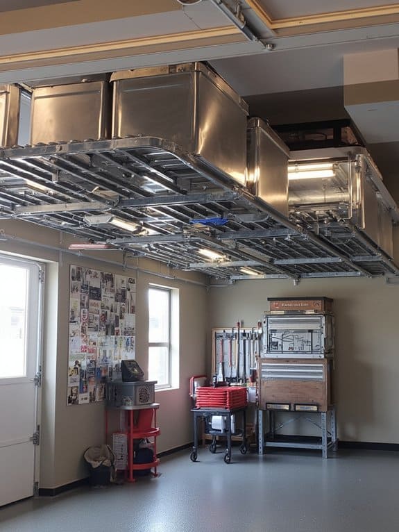 Let’s move from making the most of narrow garage spaces to tapping into the potential above your head with ceiling rack installation. You’re gonna love how ceiling storage transforms your garage with overhead organization, freeing up floor space. Install a sturdy rack—typically 4×8 feet—for seasonal items or bulky gear.