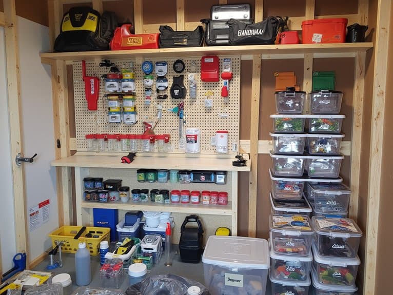 As you tackle shed organization, consider adding a foldable workbench for a game-changing storage and workspace solution. This handy setup boosts workspace efficiency by folding away when not in use, saving precious floor space in your shed. Typically, a foldable workbench measures about 48 inches wide and takes just 10 minutes to set up or collapse.