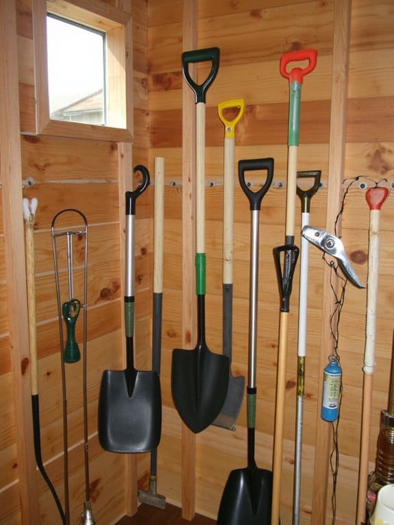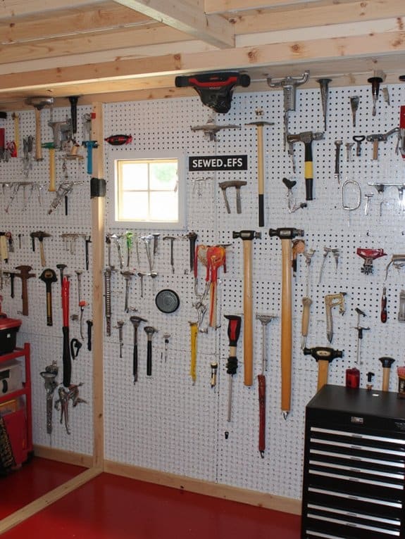 As you immerse yourself in organizing your storage shed, let’s start with a game-changer: pegboard tool storage. You’ll find pegboard benefits in freeing up floor space and keeping tools visible. With pegboard customization, tailor it to your needs by adjusting hooks and shelves.
