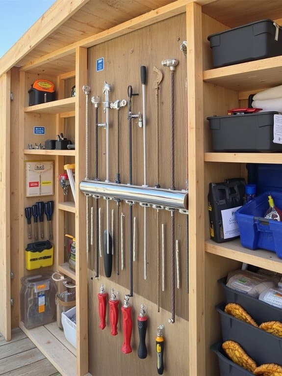 While you’re revamping your shed’s organization, let’s explore an awesome solution: the magnetic tool bar. This handy setup offers magnetic tool benefits like easy access and clutter reduction. Install a 24-inch bar on a wall for quick tool grabs, saving you minutes daily.