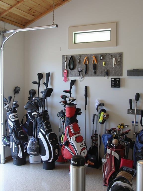 If you’re looking for a creative way to store tools in your shed, try repurposing an old golf bag. This golf bag organization idea maximizes space and keeps items handy. The golf bag benefits include multiple pockets for small tools and a sturdy frame for long-handled ones, making access easy.