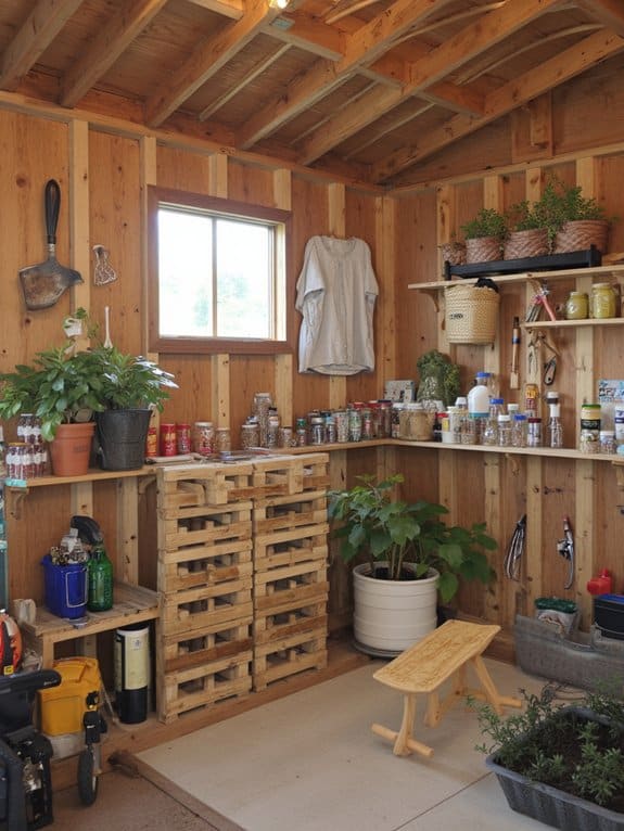 Moving from the idea of an outdoor tool rack, let’s explore another clever storage solution with pallet wall storage. You can transform your shed by using old pallets for space-saving organization. The pallet wall benefits include affordability and versatility, as they’re often free or cheap.