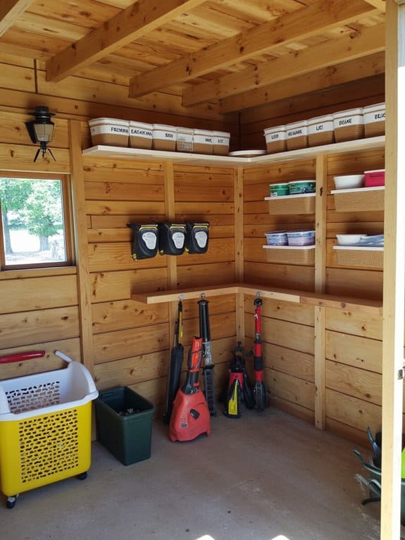 While exploring various storage solutions, let’s plunge into the practical idea of corner shelf storage for your shed. You can maximize unused space with corner storage solutions, turning awkward spots into functional areas. The corner shelf benefits are clear: they save floor space and keep items accessible.