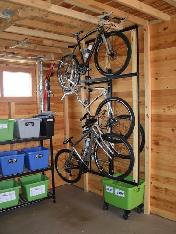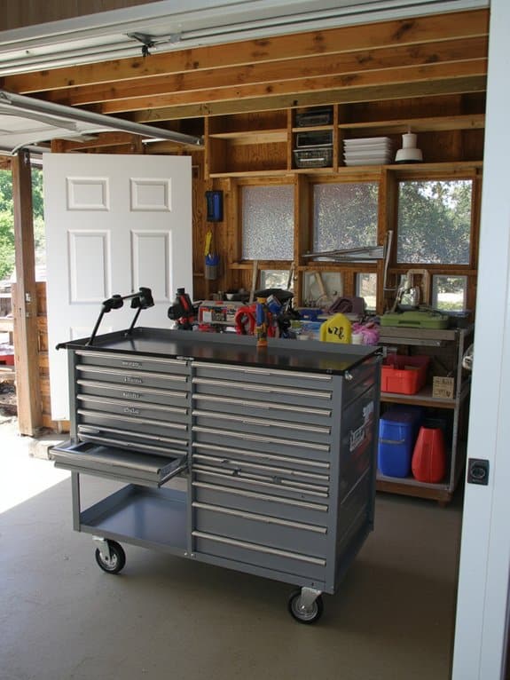 Many clever solutions can transform your shed, and a portable tool cart is a fantastic option for easy organization. With portable organization, you can move tools wherever you need them, saving time and effort. The tool cart benefits include keeping everything in one spot, roughly 3 feet wide by 2 feet deep, perfect for small sheds.