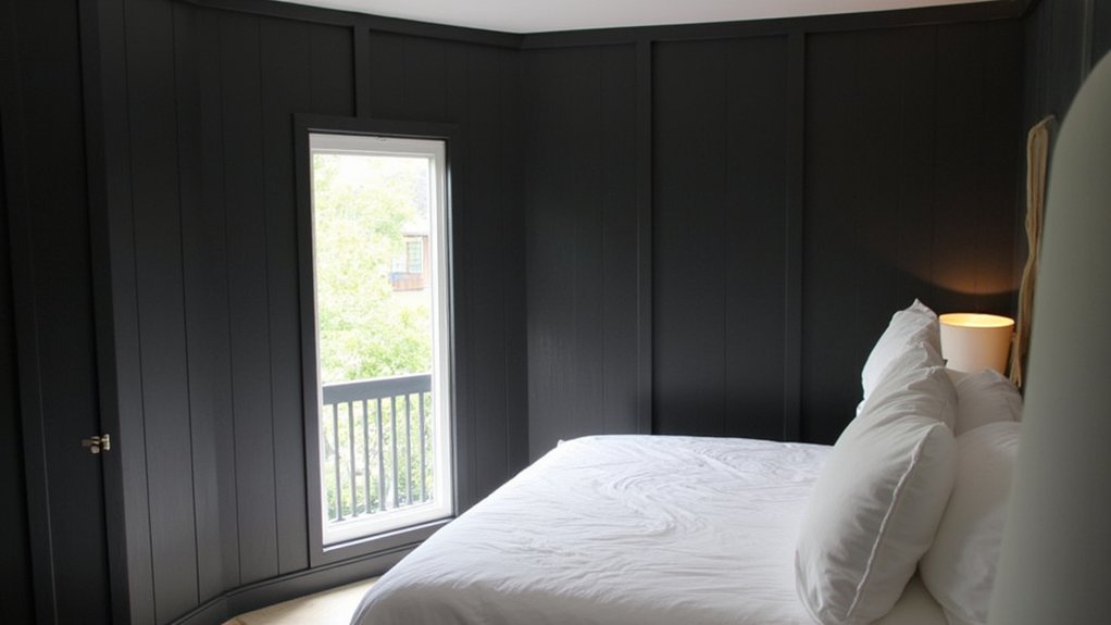 Ready for a bold change after exploring vibrant wallpaper? Immerse yourself in the striking world of dramatic black shiplap for your bedroom accent wall. You’re creating a sleek, modern vibe with this choice, using 1-inch thick boards for depth. Install them vertically on a 10×12-foot wall, spacing each 1/8 inch apart for precision.