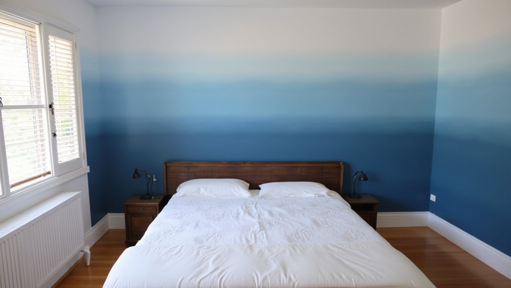 Dive right into a stunning bedroom update with chic ombre paint that blends colors for a modern twist. You’re creating a gradient effect on your accent wall, fading from dark to light over 8-10 feet. It’s a bold yet simple project you can finish in a weekend.
