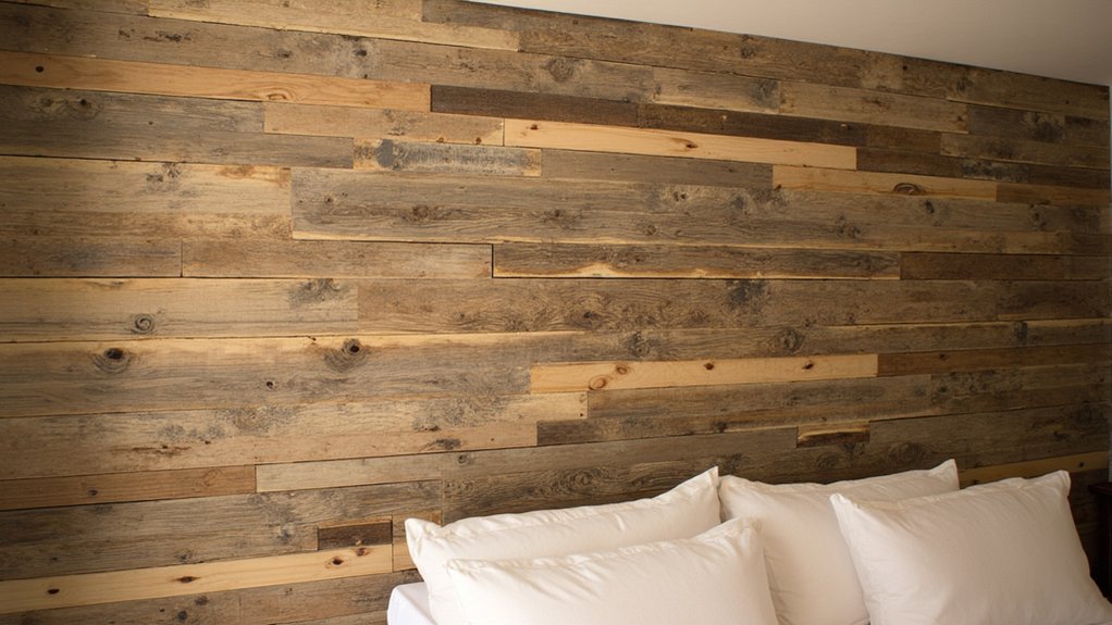 While metallic stripes bring a modern sheen, let’s immerse ourselves in the cozy charm of rustic wood paneling for your bedroom accent wall. Imagine transforming a 10×12-foot wall into a warm retreat with 1-inch thick reclaimed wood planks.