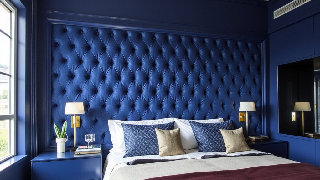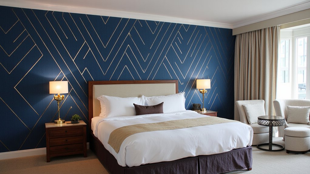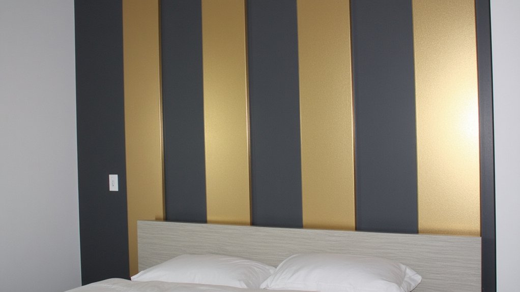 Switch gears now and explore the shimmering allure of metallic accent stripes for your bedroom accent wall. You’re creating a stunning focal point with minimal effort. Use metallic paint or tape in gold, silver, or copper for bold, 2-inch-wide stripes spaced 12 inches apart on a 9-foot wall.