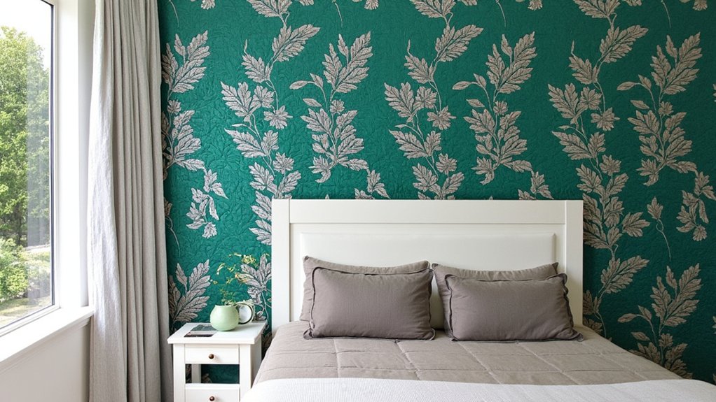 If you’re ready to elevate your bedroom’s style, consider adding vibrant textured wallpaper to your accent wall. It’s a bold choice that adds depth and personality instantly. Choose a wall behind your bed, ideally 10-12 feet wide, for maximum impact. Install it over a weekend, ensuring the surface is clean and smooth first.