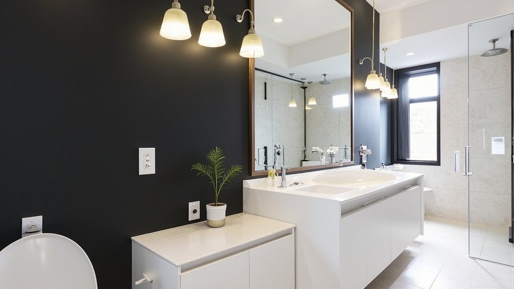 If you’re craving a bold statement in your bathroom, transform one wall into a striking black accent wall. This dramatic choice adds depth and modern flair instantly. Pick a wall that’s 8-10 feet wide, ideally behind the vanity, to anchor the space.