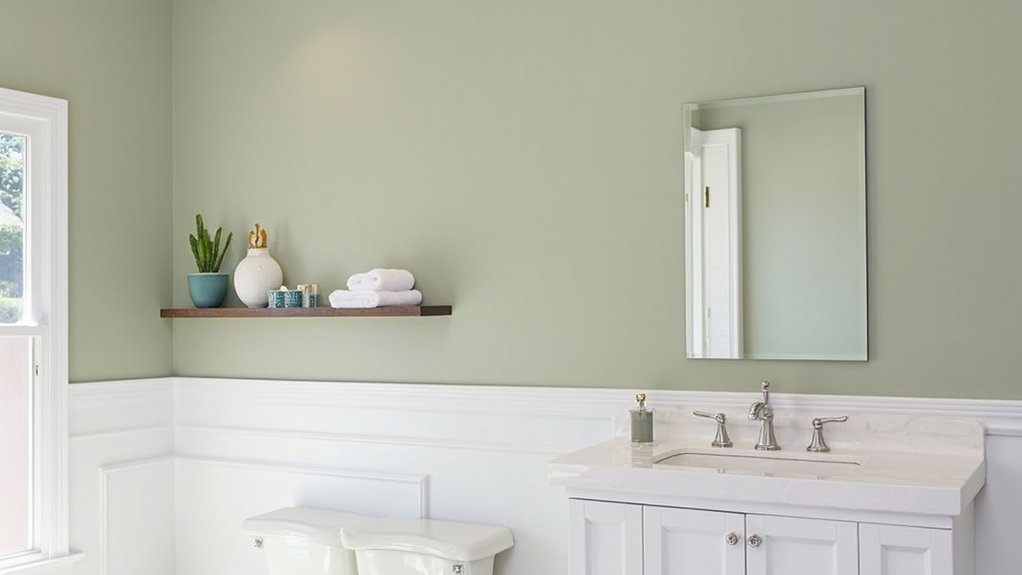 While a bold color can energize, switch gears and create a calming oasis with a soothing sage accent wall in your bathroom. This muted green tone brings a natural, serene vibe. Pick a wall behind the vanity, roughly 5×8 feet, and paint it in under 2 hours.