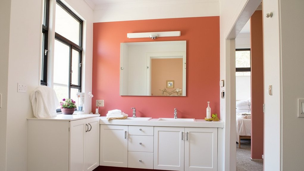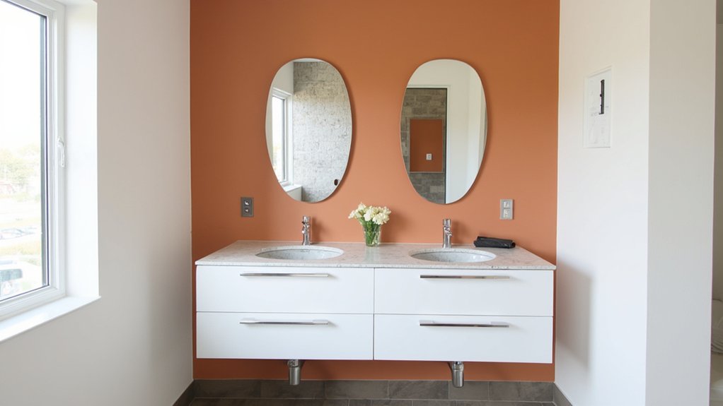 Bring a cozy vibe to your bathroom by painting a warm terracotta accent wall that radiates earthy charm. You’ll transform the space into a welcoming retreat with this rich, natural hue. Start by choosing a wall behind the vanity for impact, roughly 8-10 feet wide.