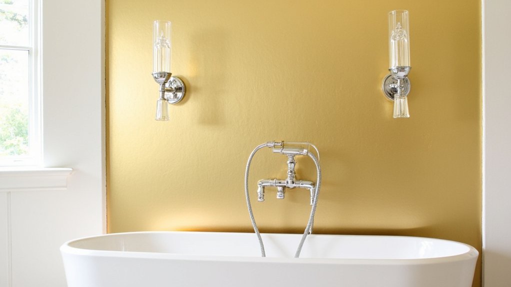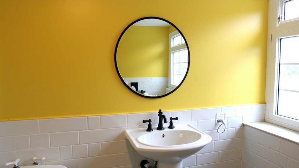 Plunge into a vibrant update with a sunny yellow accent wall that’ll brighten your bathroom instantly. You’re transforming a dull space into a cheerful haven with just one wall, ideally the one behind your vanity, measuring about 8×10 feet. Paint it in under 4 hours using a satin finish for easy cleaning.