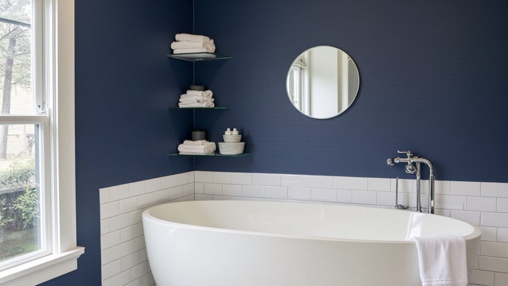 Plunge into the world of bathroom design with a bold navy accent wall that transforms your space instantly. You’re crafting a modern, sophisticated vibe in just one weekend with a 10×8-foot wall. Grab a gallon of navy paint, a 2-inch brush, and painter’s tape for crisp edges.