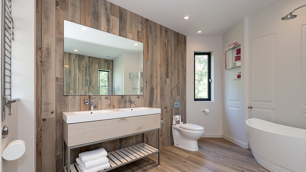 Moving from the serene vibe of a cool mint accent wall, let’s explore a warmer, natural option with a rustic wood accent wall. You’re bringing earthy charm into your bathroom with reclaimed wood planks, roughly 6-8 inches wide. Install them vertically on a 5×8-foot wall for impact; it takes about 4-6 hours.