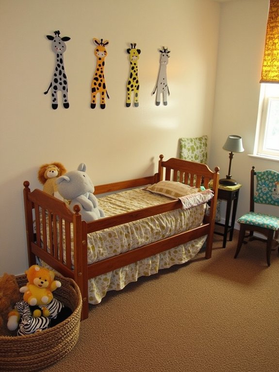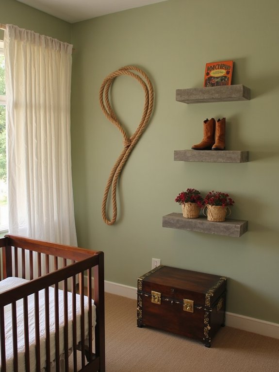 Western rope wall accents transform a toddler’s bedroom into a charming cowboy-themed space through decorative lasso designs and rustic rope elements mounted on the walls. The combination of figure-eight patterns, rope borders, and personalized name plaques creates an authentic ranch atmosphere that encourages creative play.