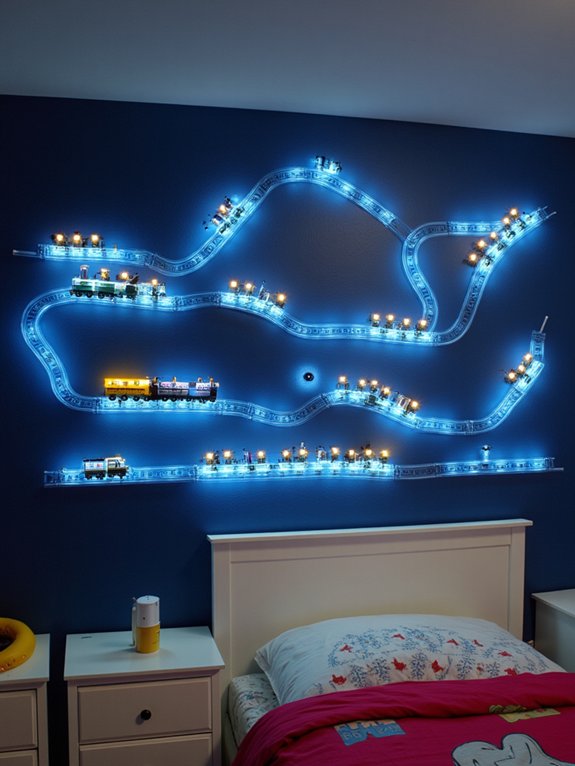 A light-up train track display combines functional lighting with imaginative decor in a child’s bedroom. LED strip lighting installed along baseboards creates illuminated railway paths, while battery-operated lanterns mark station stops. Motion-activated sound effects add authentic train whistles and crossing bells to enhance the experience.