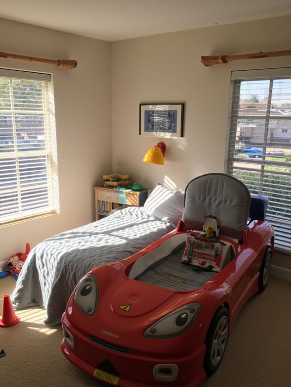 An ocean adventure theme transforms a toddler’s bedroom into an immersive underwater world. The design incorporates ocean-themed bedding with playful sea creatures, while nautical wall decals bring waves and marine life to the walls. A boat-shaped bed with a steering wheel and portholes serves as the centerpiece, making bedtime an exciting voyage.