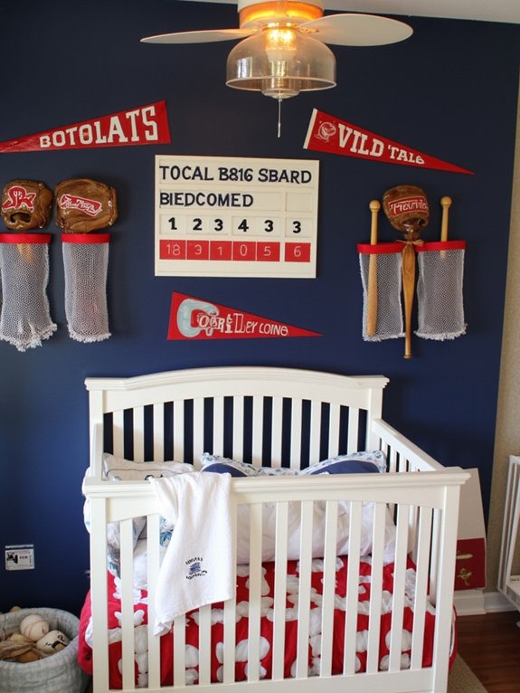 A sports-themed bedroom display celebrates young fans’ enthusiasm through strategic placement of team memorabilia. By mounting jerseys, pennants, and protective cases of signed collectibles at child-accessible heights, the room becomes an interactive tribute to favorite teams and players.