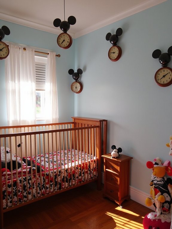 For optimal display, mount the clocks at child-height level and arrange them in odd-numbered groupings. Combining classic black-and-white designs with colorful contemporary pieces creates visual interest and maintains the timeless appeal of Mickey Mouse memorabilia.