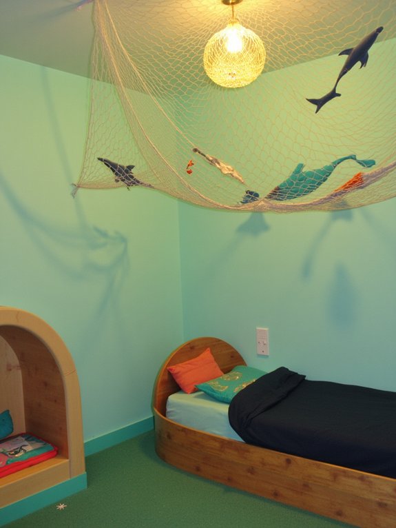 Blue ombre wallpaper creates depth from ceiling to floor, while jellyfish pendant lamps cast gentle wave patterns across the room. These elements combine to create a soothing yet imaginative space where children can drift off to sleep surrounded by the magic of the ocean.