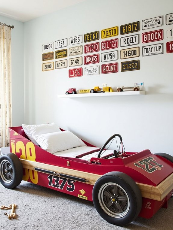 Parents can personalize the collection by incorporating custom plates featuring children’s names or birth years, making the display both decorative and meaningful. The arrangement celebrates automotive heritage while adding distinctive character to any room, particularly fitting for garages, playrooms, or modern industrial-style spaces.